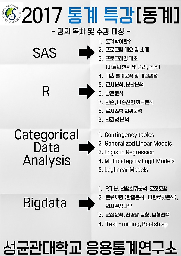 자세한 사항은 아래의 성균관대학교 응용통계연구소 홈페이지에 통계특강 베너를 클릭하여 확인하여 주시기 바랍니다.
