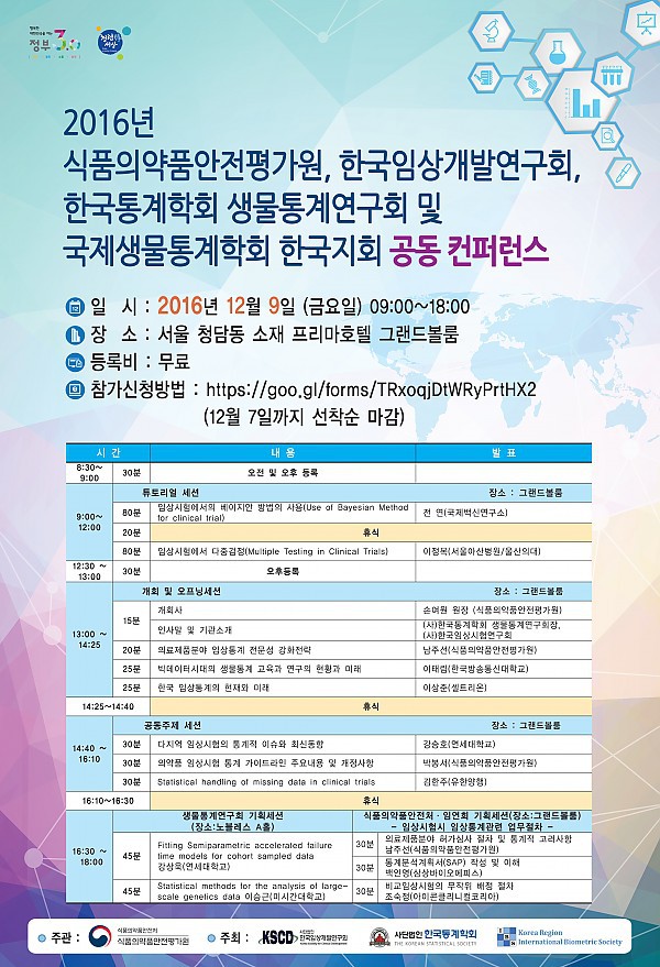 [안내]2016년 식품의약품안전평가원, 한국임상개발연구회, 한국통계학회 생물통계연구회 및 국제생물통계학회 한국지회 공동 컨퍼런스