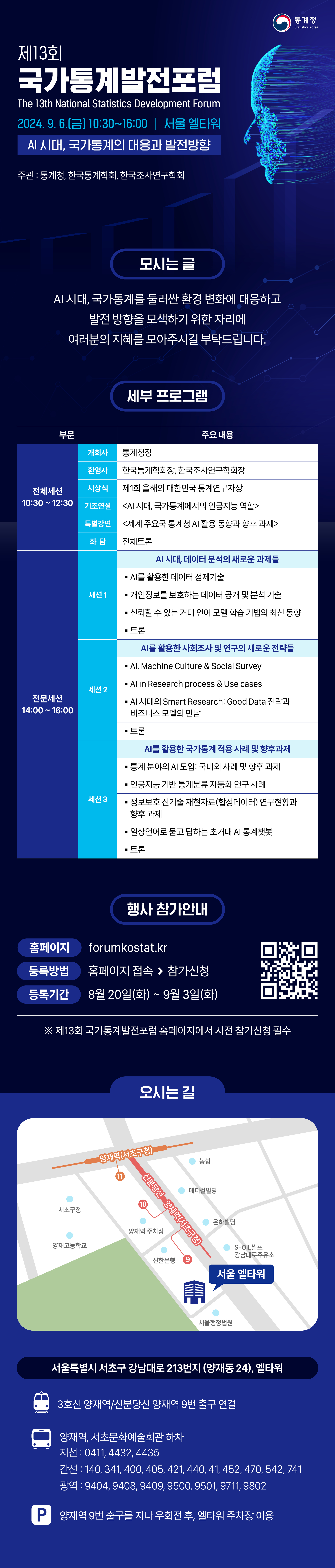 통계청과 한국통계학회 그리고 한국조사연구학회가 공동으로 주관하는 국가통계발전포럼이 개최될 예정임을 알려드립니다.