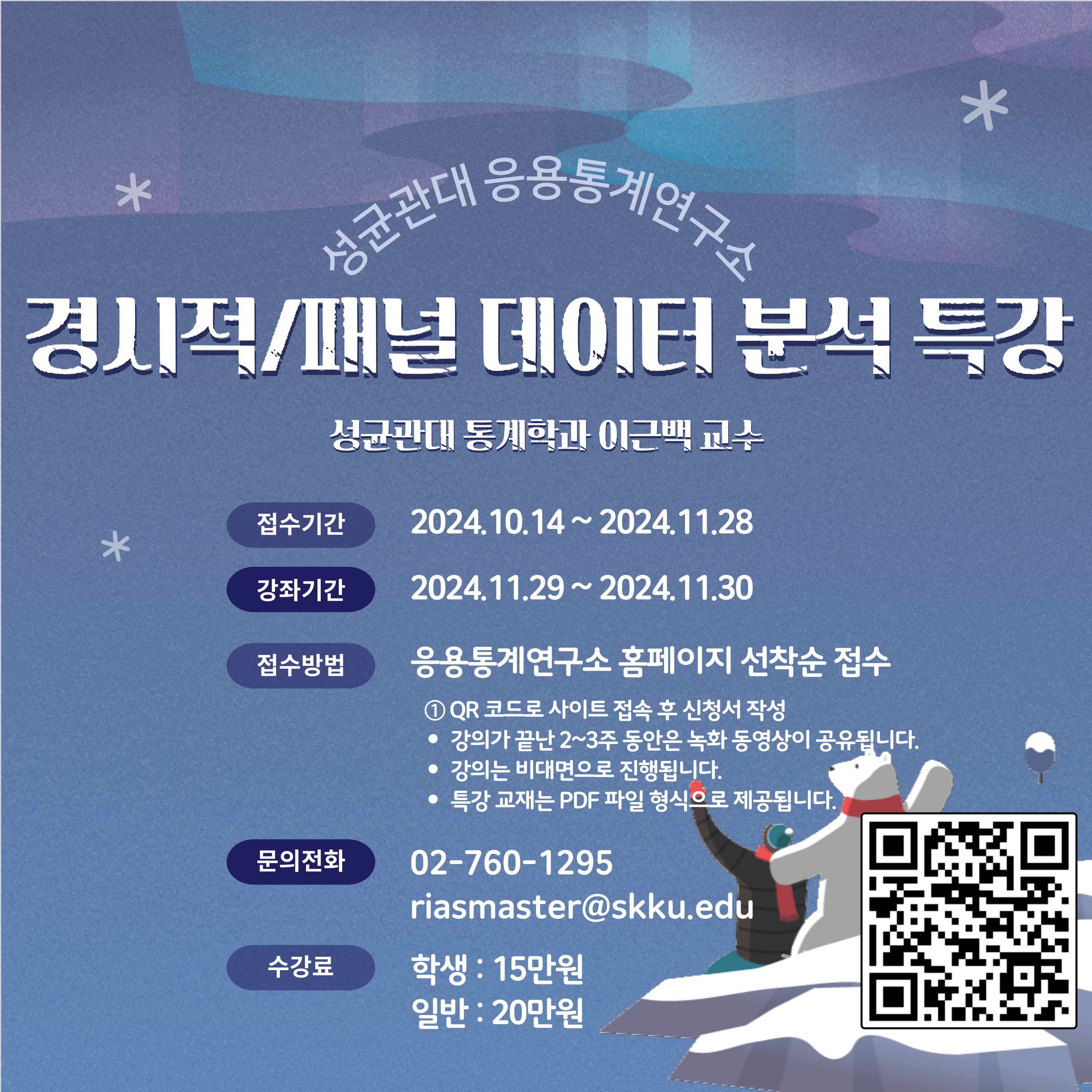 - 경시적/패널 데이터 분석 강좌 수강료 (등록비 1만원 및 교재포함, 강좌별별도)