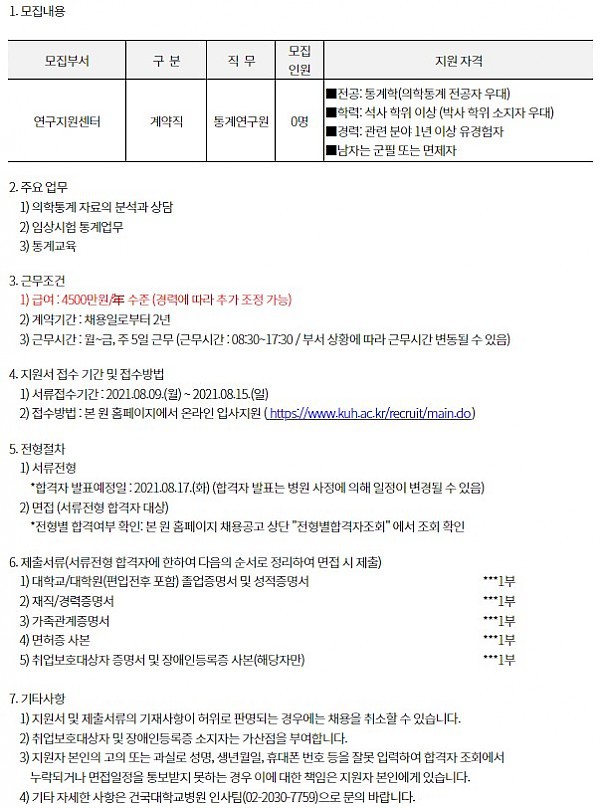 안녕하세요. 건국대학교병원 연구지원센터 계약직 통계연구원을 모집한다고 합니다.