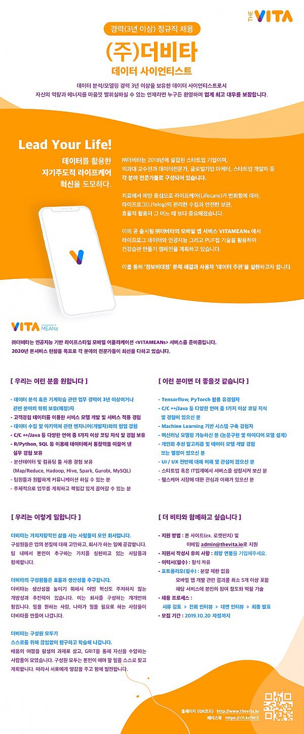 (주)더비타에서 데이타사이언티스트를 모집합니다.