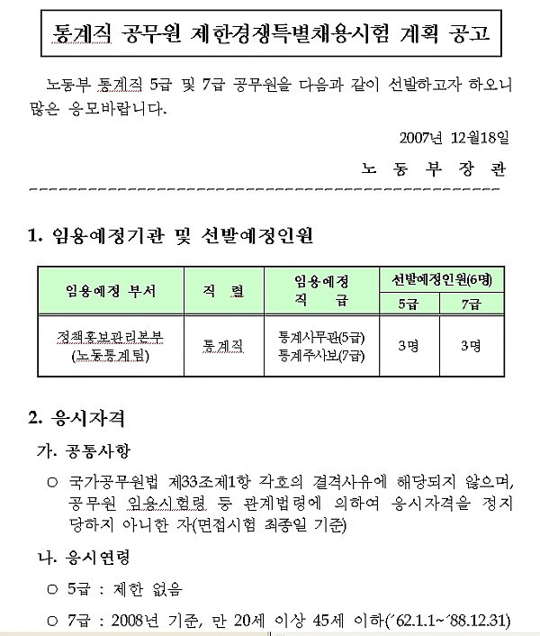 노동부 통계직 공무원 제한경쟁특별채용시험 계획 공고