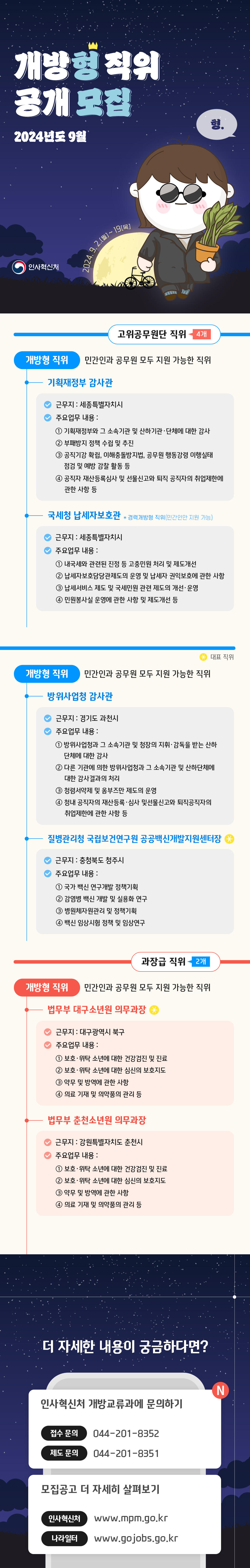 인사혁신처에서는 2024년 9월 고공단 및 과장급 개방형 6개 직위를 붙임과 같이 선발하고 있습니다.