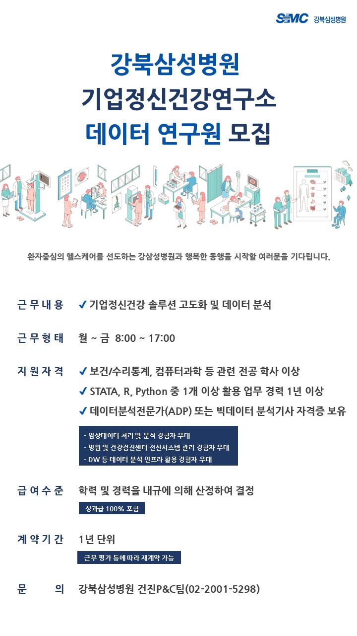강북삼성병원 기업정신건강연구소에서 위와 같이 데이터 담당 연구원 채용공고를 진행하고 있습니다.