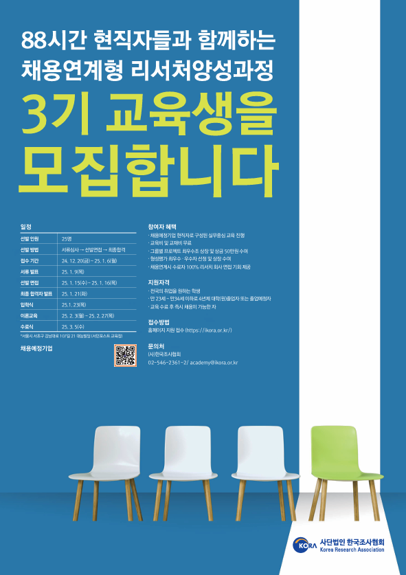 (사)한국조사협회에서는 마케팅, 여론/사회조사 리서처를 꿈꾸며 취업을 준비하는 학생들을 대상으로 조사 산업 현장에서 필요로 하는 실무지식과 직무역량을 함양시켜 조사 산업에 특화된 인재를 양성하고 있습니다.