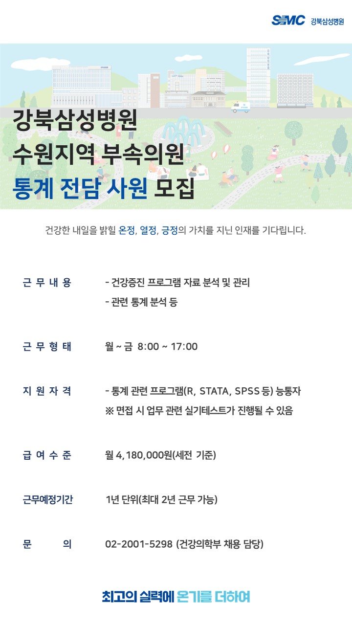 강북삼성병원 건강의학부 소속 수원부속의원에서 통계전담 사원을 채용하고자 합니다.
