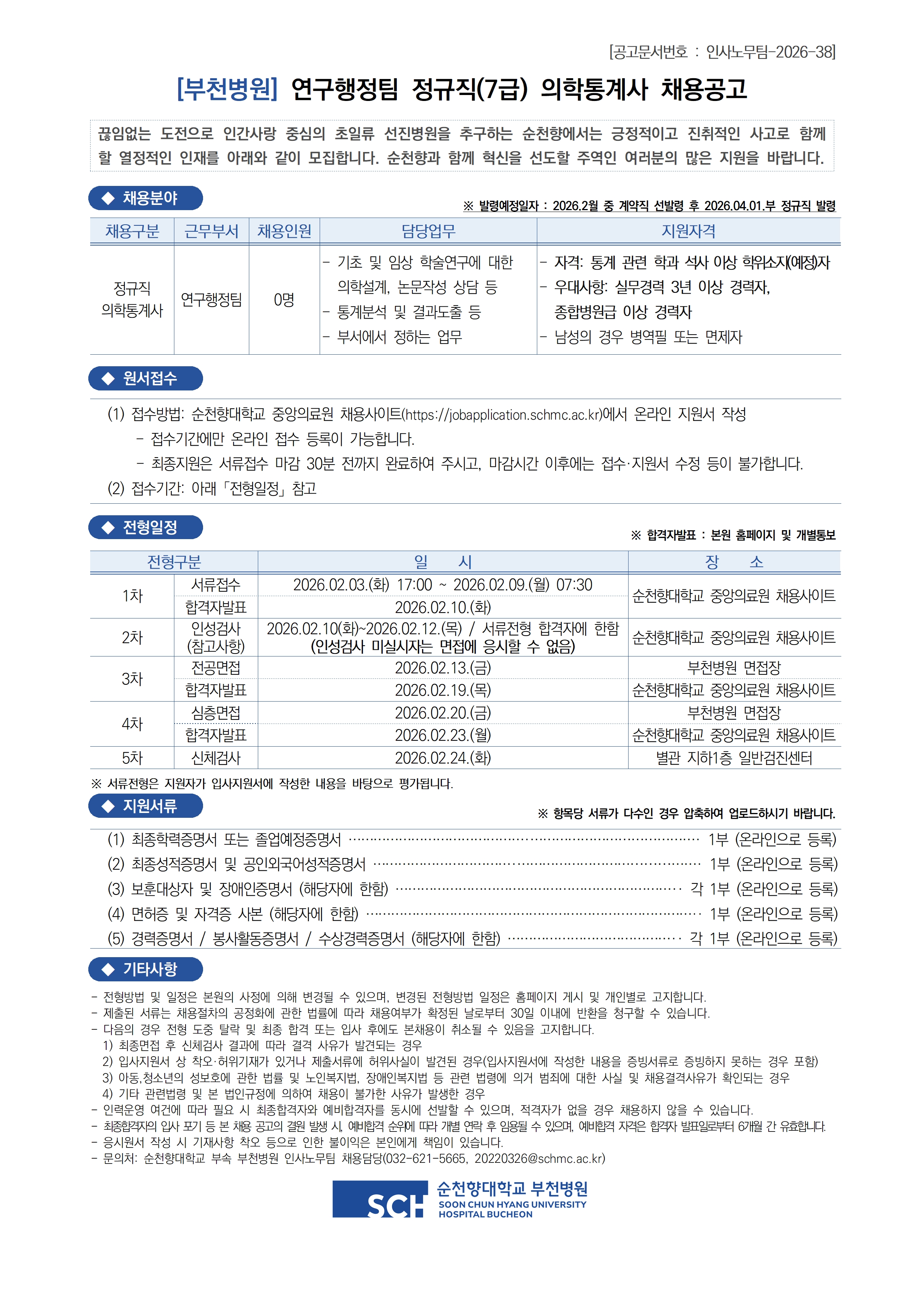 [채용] 순천향대학교 부천병원 연구행정팀 정규직(7급) 의학통계사 채용공고