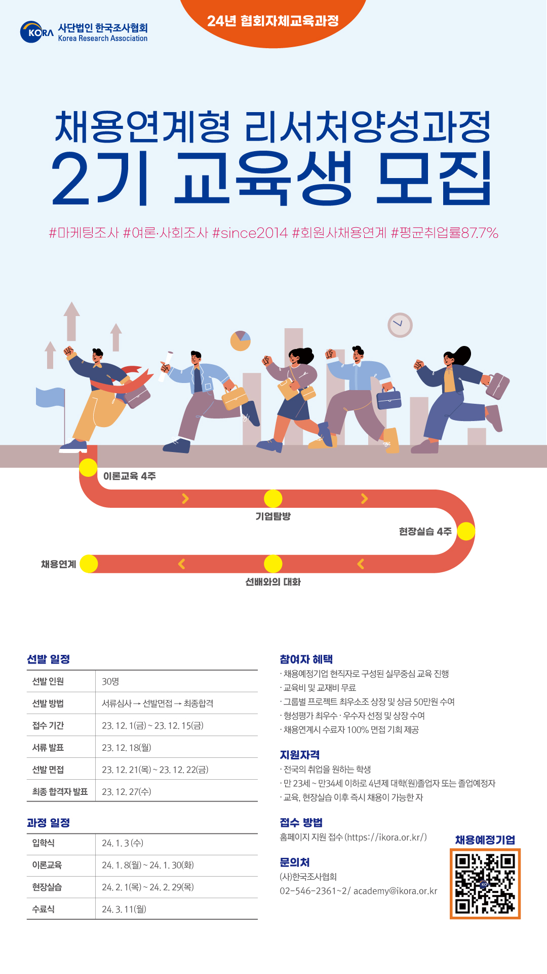 (사)한국조사협회가 마케팅, 여론/사회조사 리서처를 꿈꾸는 전국의 취업을 원하는 학생들을 대상으로 교육, 현장실습 이후 채용연계를 진행하며,